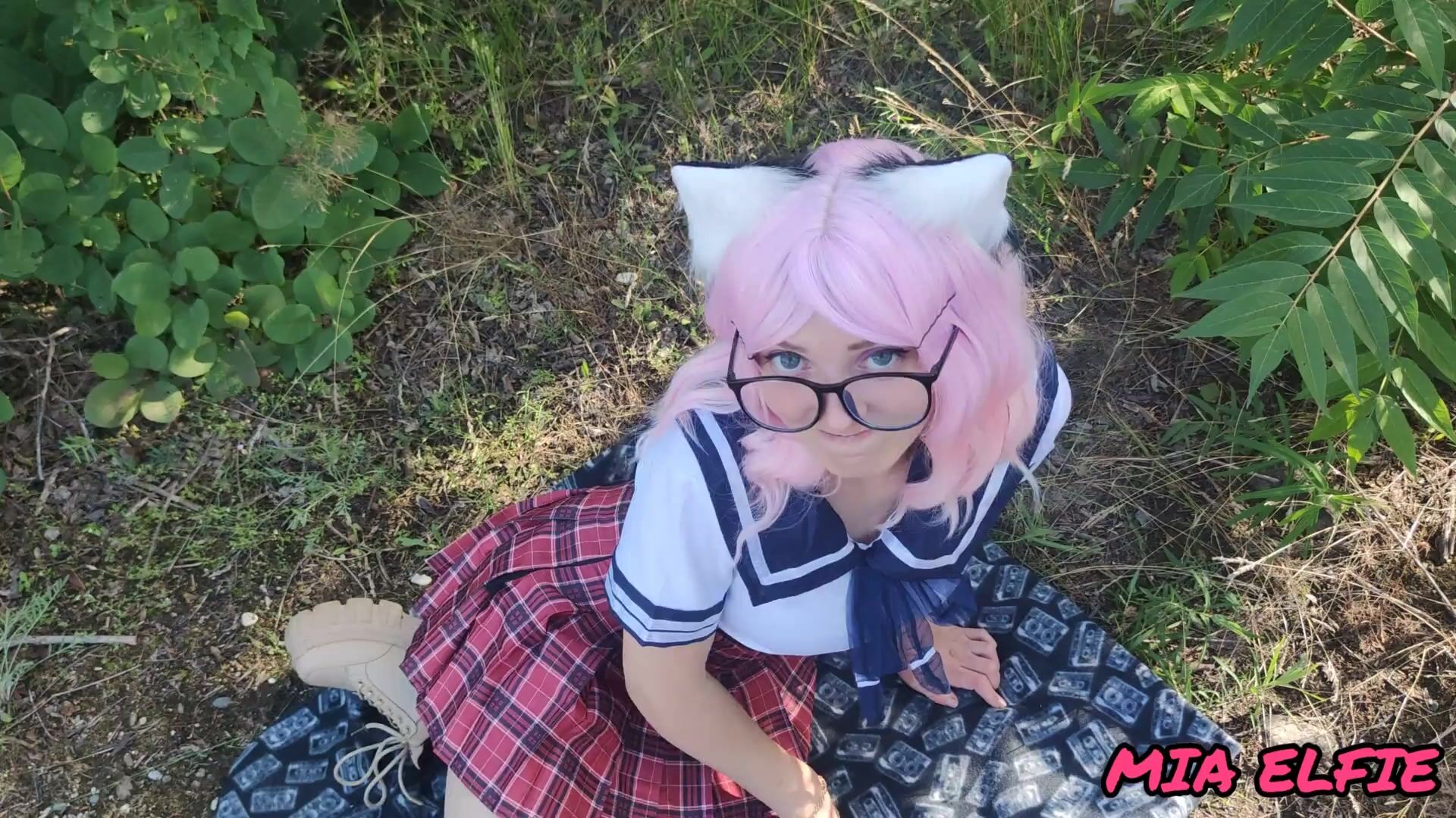 beautiful cute schoolgirl in a skirt and glasses walks and gives a passionate beautiful blowjob