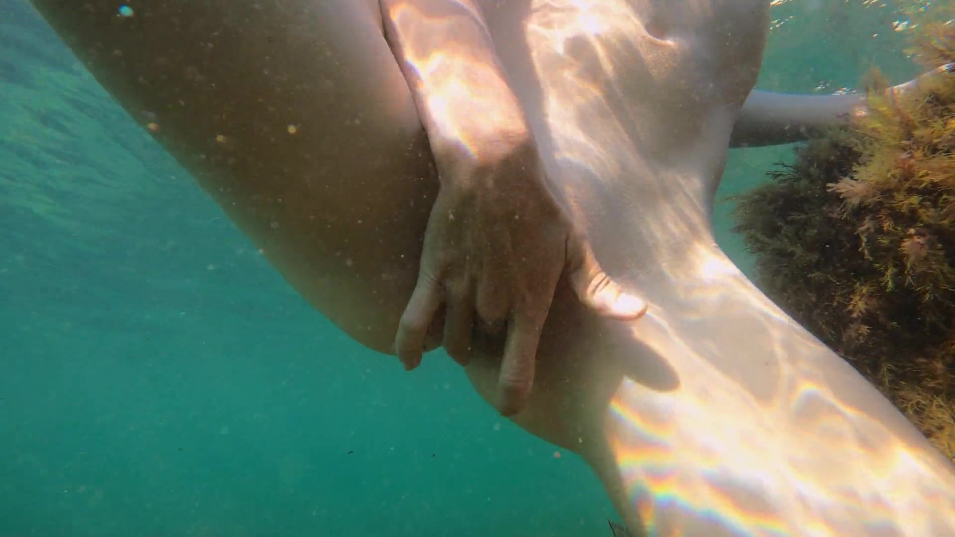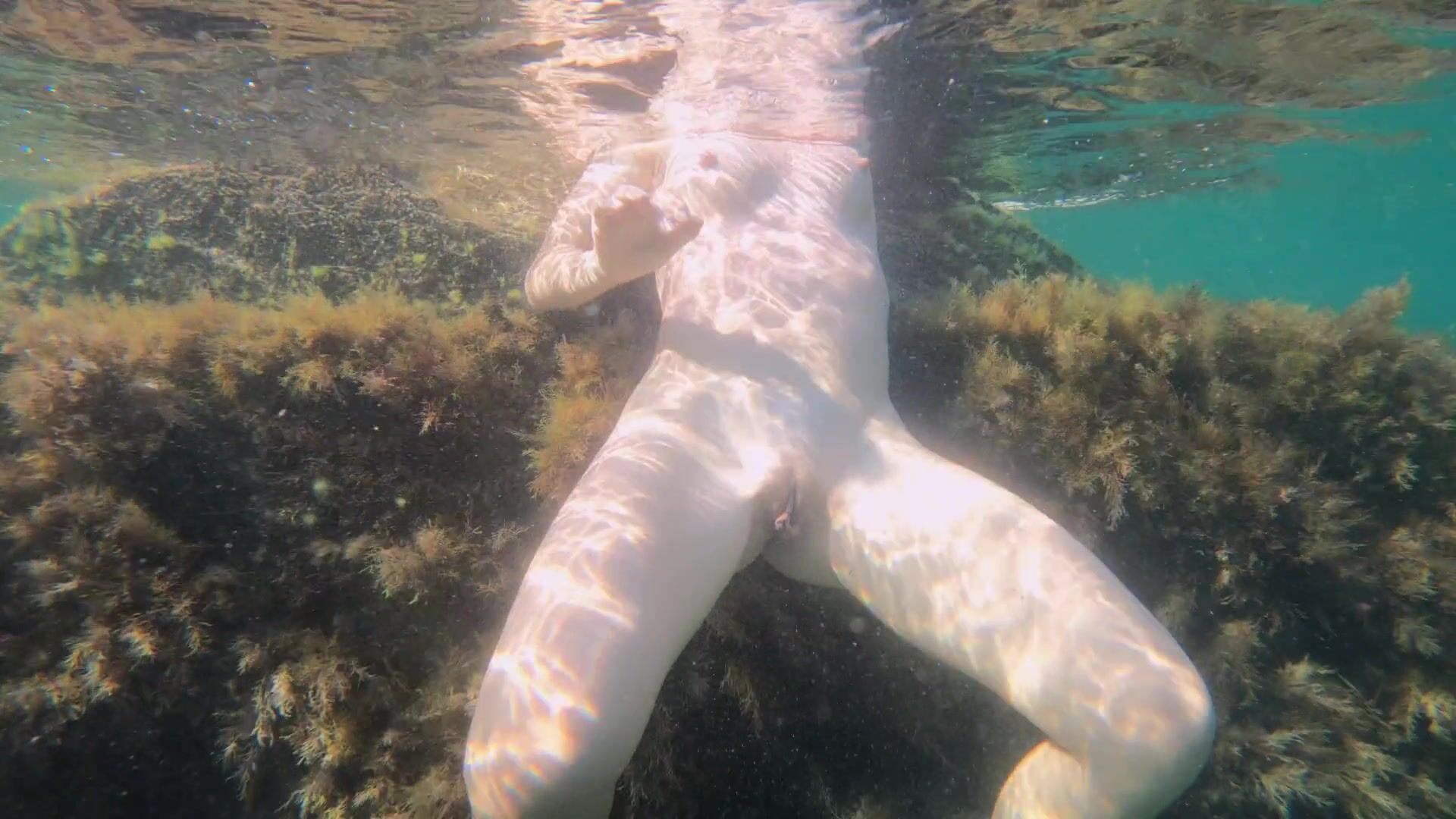 Slim girl swims naked in sea and masturbate her pussy