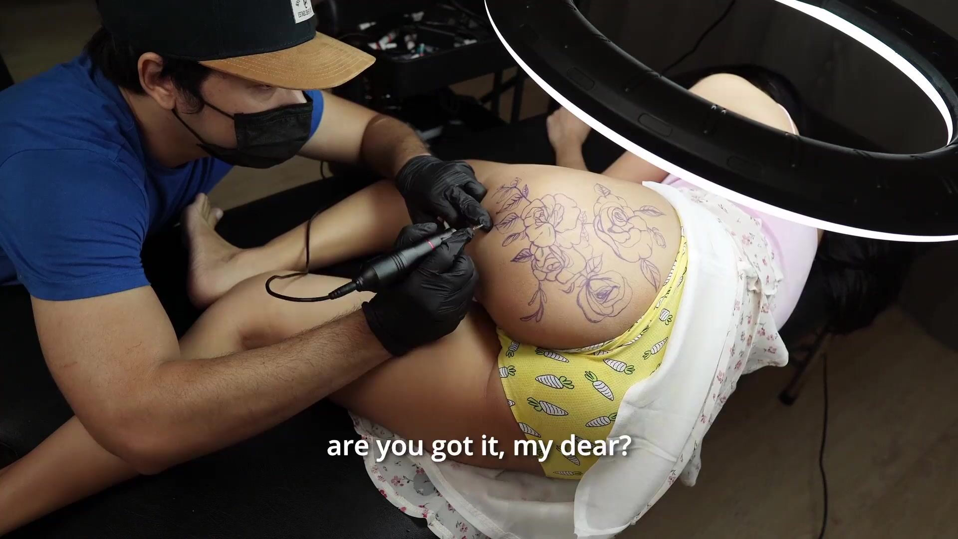 Big Ass girl while tattoo ,feeling horny and seduce the artist