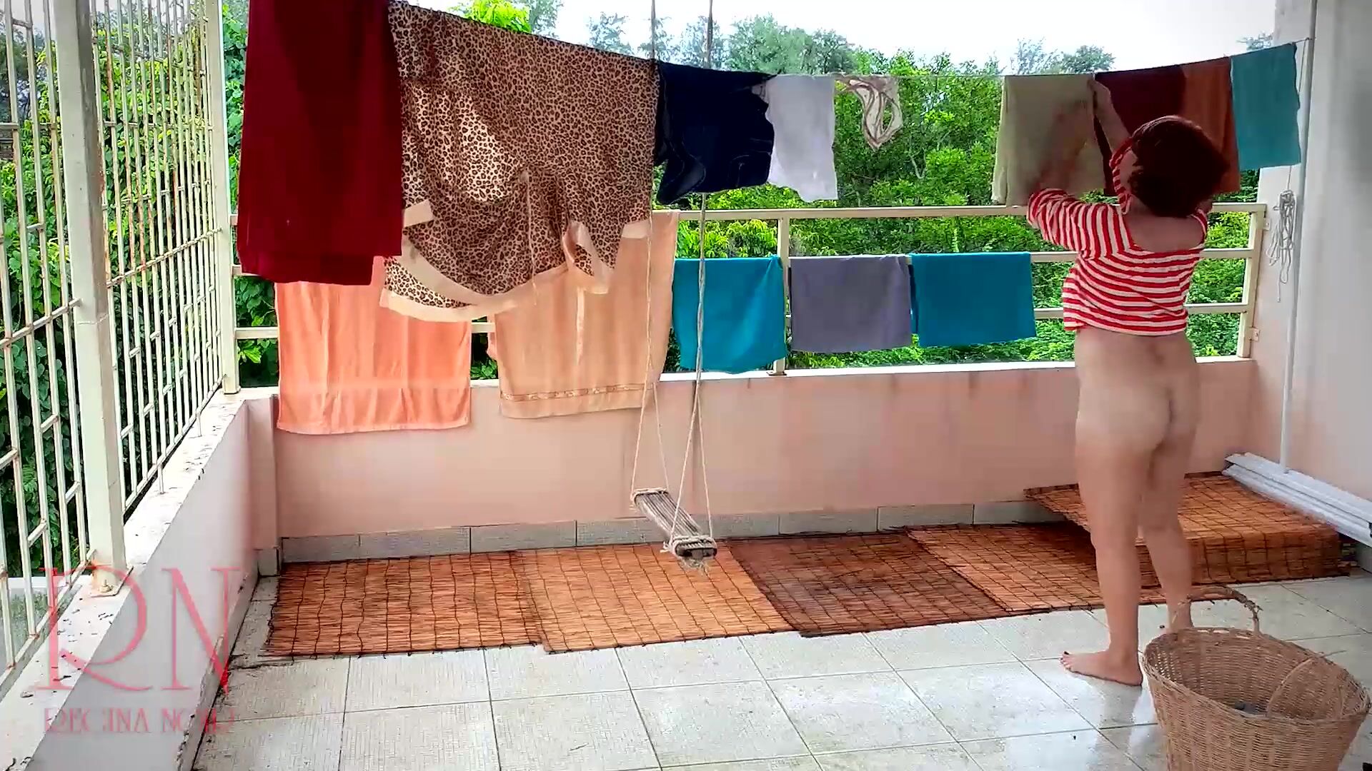Naked laundry. The maid is drying clothes in the laundry.