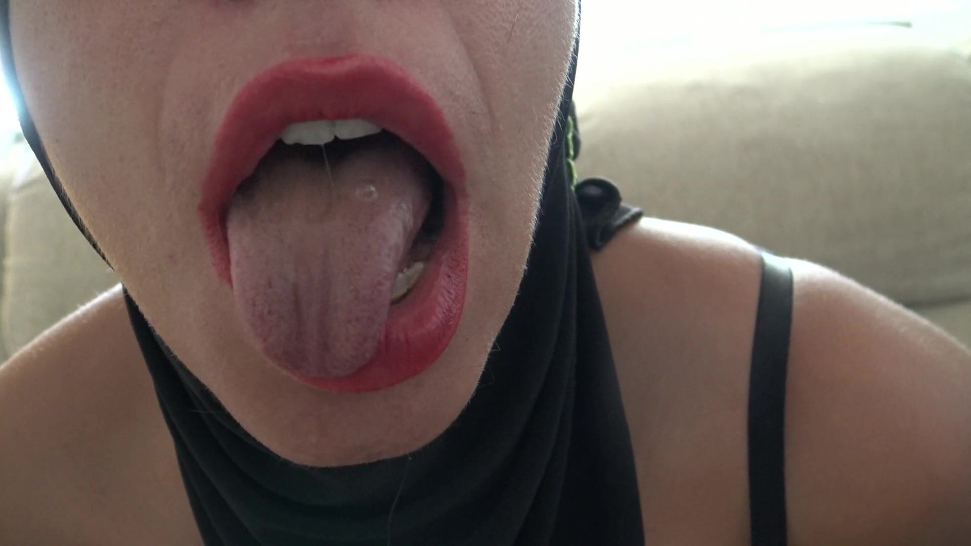 A mature woman wearing a bondage suit shows off her ...